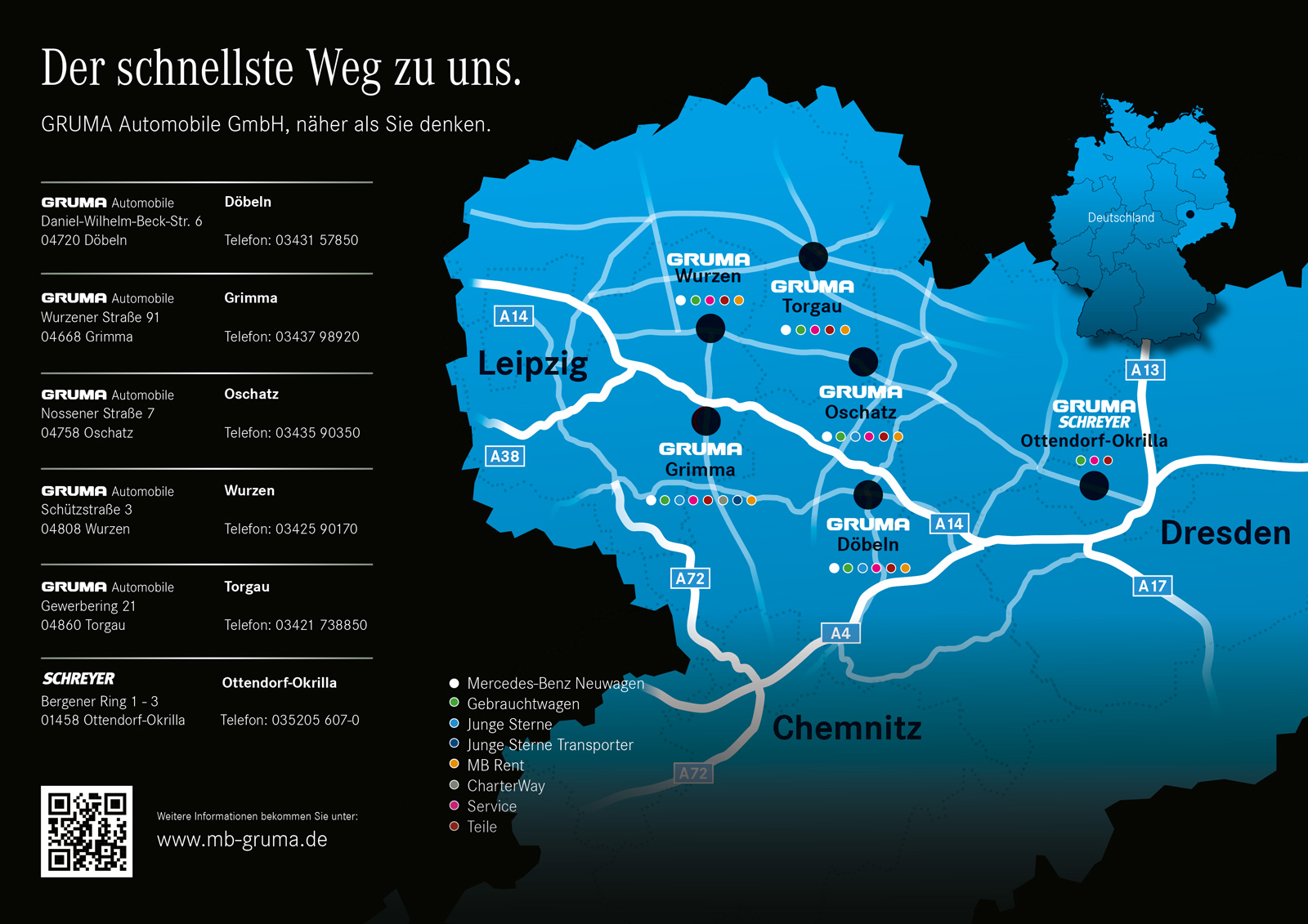 Neugierig geworden? Dann besuchen Sie einen Händler in ihrer Nähe – Ihren zertifizierten Mercedes-Benz Ansprechpartner zwischen Leipzig und Dresden. Mit rund 250 Mitarbeitern an fünf Standorten – Döbeln, Grimma, Oschatz, Wurzen und Torgau – sind für Sie da, wenn es um Beratung, Verkauf oder Service geht. Entdecken Sie den neuen CLA!