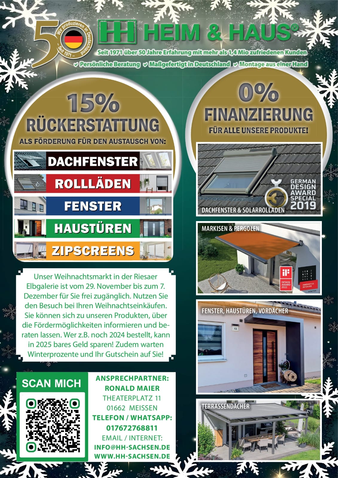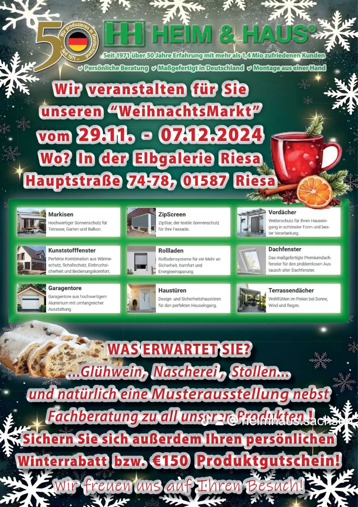 Der Winter steht vor der Tür, und mit ihm kommt eine ganz besondere Aktion in die Elbgalerie Riesa! Noch bis zum 7. Dezember veranstaltet Heim & Haus einen festlichen Weihnachtsmarkt, der nicht nur weihnachtliche Stimmung verspricht, sondern auch exklusive Einblicke in hochwertige Produkte und attraktive Angebote bietet.