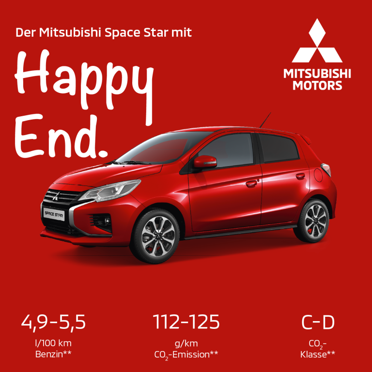 Space Star – Auslaufmodell – Energieverbrauch 4,9-5,5 l/100 km Benzin; CO2-Emission 112-125 g/km; CO2- Klasse C-D; kombinierte Werte.*
