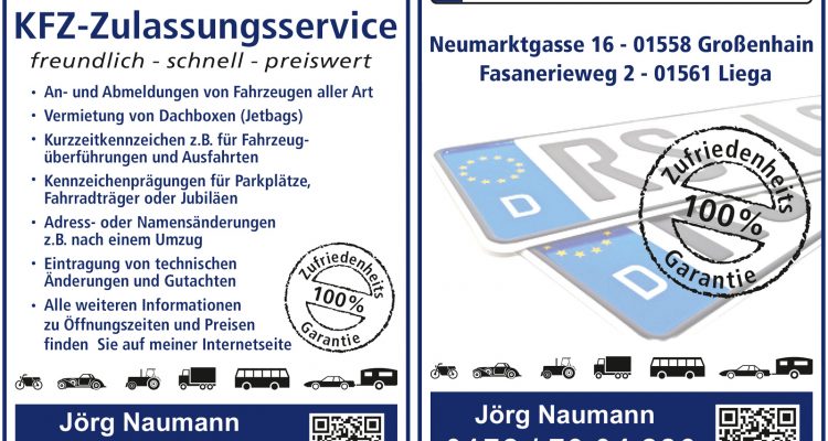 Als Ihr Profi für KFZ-Zulassungen im Landkreis Meißen erledige ich für Sie alle Angelegenheiten auf der Zulassungsstelle. Egal ob Sie Ihr Fahrzeug von Privat oder im Autohaus kaufen, ich biete Ihnen als freundlicher KFZ-Zulassungsservice seit 2007 hier im Elbland einen kompletten Rundumservice. Meine Leistungen sind KFZ-Zulassungen von Neu- und Gebrauchtfahrzeugen aller Art, Abmeldungen auch online, Namensänderungen nach Eheschließung, Adressänderungen nach Umzug, technische Eintragungen, Kurzzeitkennzeichen für Fahrzeugüberführungen oder Probefahrten für alle Fahrzeuge wie PKW, LKW, Busse, Motorräder, Kleinkrafträder, Quads, Anhänger oder Traktoren. Prägung von Kennzeichen für Onlinezulassungen oder einen Fahrradträger. Wenn nötig unterstütze ich Sie nach dem Verlust von Fahrzeugkennzeichen oder Fahrzeugdokumenten. Nie wieder warten auf freie Onlinetermine, Ihre Zulassung erfolgt meist sofort. Sparen Sie sich den Weg auf die Zulassungsbehörde. Warum dafür einen Tag Ihres wohlverdienten Urlaubes opfern! Ich biete Ihnen eine 100%tige Zufriedenheitsgarantie, überzeugen Sie sich selbst. Informationen zu den Büros und Preise u.v.m. finden Sie auf meiner Internetseite.