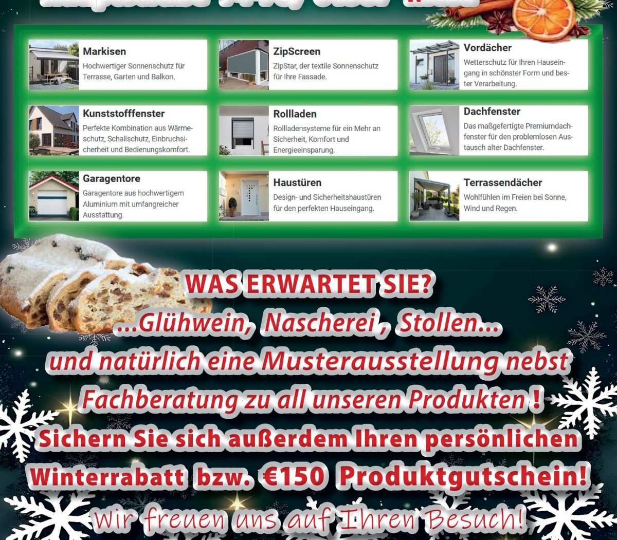 Der Weihnachtsmarkt lockt mit gemütlicher Atmosphäre, Glühwein, Stollen und weiteren Leckereien, die die Vorfreude auf die Feiertage steigern. Doch das Highlight sind die vielseitigen Präsentationen und Fachberatungen zu Qualitätsprodukten für Ihr Heim und Haus.