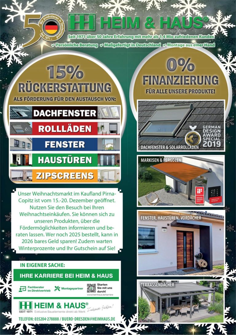 Ein besonderes Schmankerl wartet auf alle, die sich für die Modernisierung ihres Zuhauses interessieren: 15 % Rückerstattung als Förderung für den Austausch von Dachfenstern, Rollläden, Fenstern, Haustüren oder ZipScreens. Außerdem profitieren Kunden von einer 0 % Finanzierung auf alle Produkte. Als zusätzlicher Anreiz gibt es einen Winterrabatt oder einen Produktgutschein im Wert von 150 €!